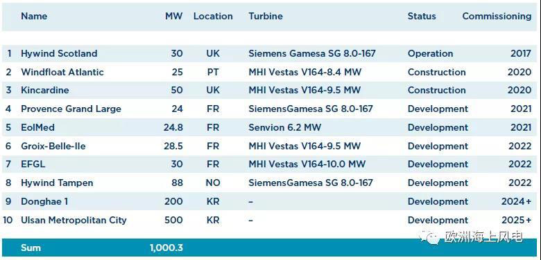 在建項(xiàng)目(未全部投運(yùn),至少安裝了一臺風(fēng)機(jī))2個(gè):葡萄牙Windfloat Atlantic,25MW;英國Kincardine,50MW。