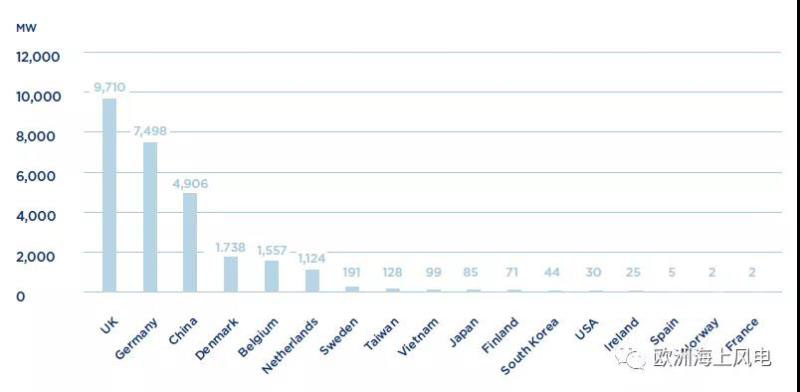 ▲各國海上風(fēng)電累計(jì)裝機(jī)容量