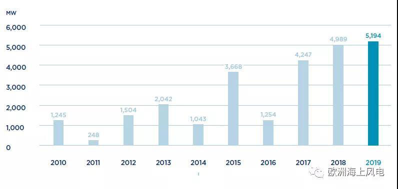 2019年,全球海上風(fēng)電新增裝機(jī)容量5.2GW,單年新增裝機(jī)創(chuàng)歷史新高。
