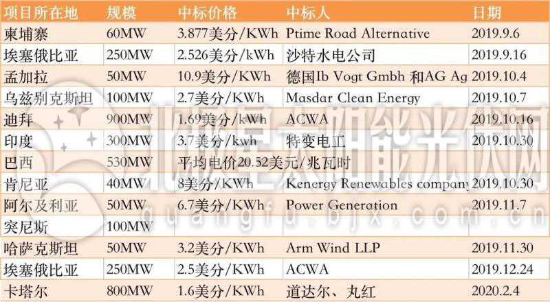 上表是不完全統(tǒng)計的2019年以來的光伏中標(biāo)情況,總規(guī)模共計3.4GW,其中最高中標(biāo)電價為孟加拉項目,中標(biāo)價格為10.9美分/KWh,最低中標(biāo)價格為1.6美分/KWh,由道達爾和丸紅中標(biāo)的卡塔爾800MW項目。