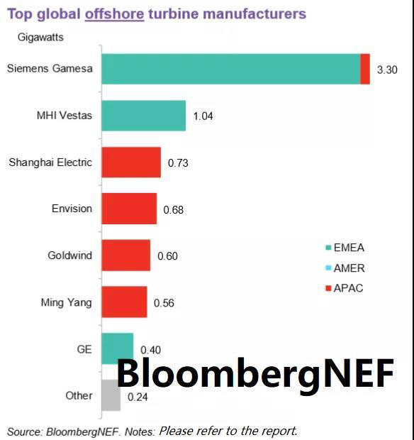 中國海上風(fēng)電市場(chǎng)的快速崛起使得上海電氣,遠(yuǎn)景能源,金風(fēng)科技,明陽智慧能源分別位列第三到第六。