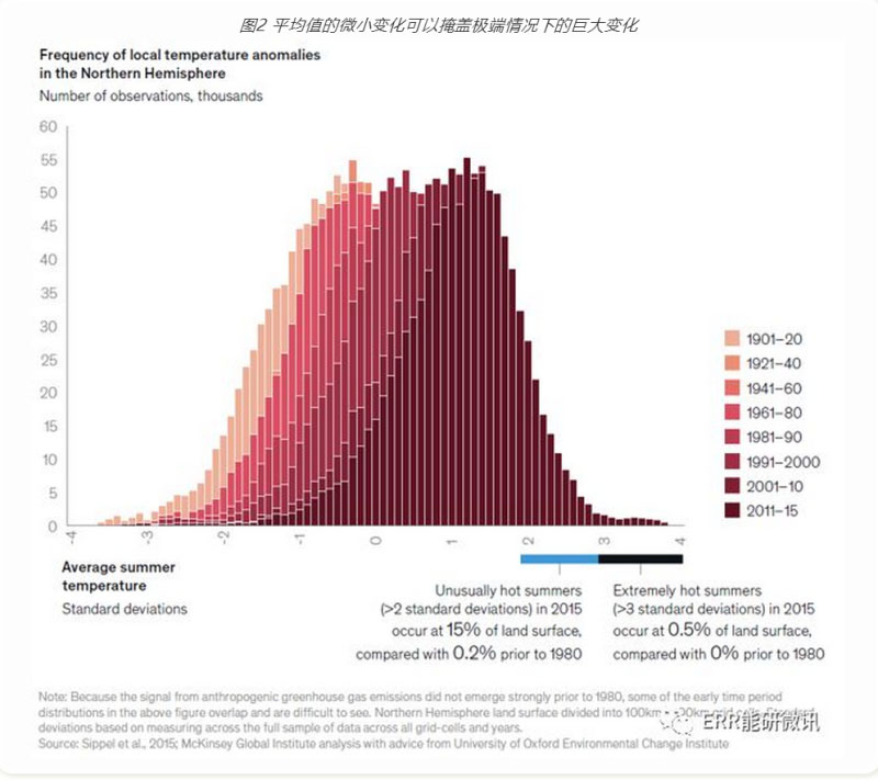 平均值掩蓋了極端情況下更為顯著的變化。在統(tǒng)計方面,溫度的分布正向右移動(向暖化方向)并逐漸變寬。這意味著許多地方的平均日數現在更熱了(“變化的方式”),極熱的日數變得更可能(“肥尾巴”)。例如,北半球每100×100平方公里觀測到的夏季平均溫度分布的演變表明,夏季平均溫度隨著時間的推移而增加。北半球(以平方公里為單位)經歷了一個相當炎熱的夏天的百分比增加了15倍(從不足1%增至15%),即一年中平均氣溫升高兩個標準差。北半球(以平方公里為單位)經歷了一個酷熱的夏天,在一個特定的夏天,三個標準差更熱的平均溫度所占的比例從零上升至0.5%。