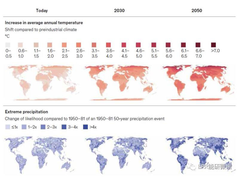 我們關注的是有形風險,即氣候變化的有形影響所產生的風險,包括對人、社區(qū)、自然和有形資本以及經濟活動的潛在影響,以及對公司、政府、金融機構和個人的影響。物理風險是其他氣候風險類型(轉型風險和責任風險)的基本驅動力。我們不關注轉型風險,即脫碳影響或與氣候變化相關的責任風險。雖然對脫碳及其帶來的風險和機遇的理解是一個關鍵的話題,但本報告通過探討在未脫碳的情況下,未來1~30年持續(xù)的氣候變化的性質和代價做出了貢獻。