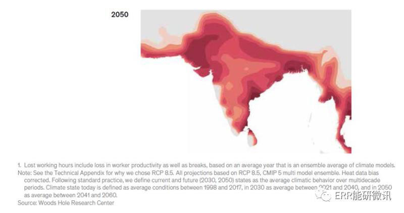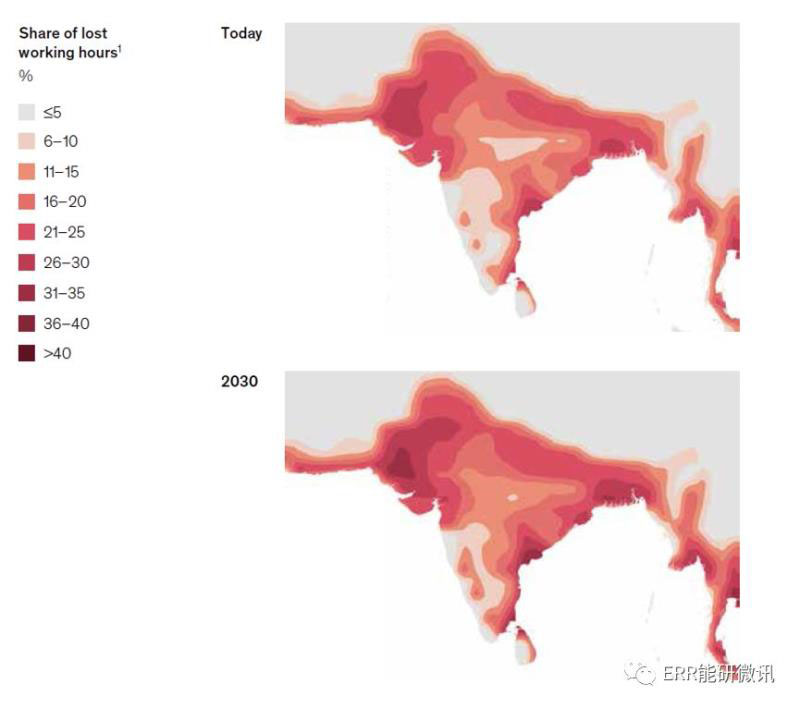 戶外勞動生產率預計也會下降,從而減少可以在戶外工作的有效小時數。截至2017年,在印度,高溫作業(yè)產生了約50%的GDP,推動了約30%的GDP增長,雇傭了約75%的勞動力,約3.8億人。到2030年,根據我們的估計,印度的平均白天工作時間損失可能會增加到每年占GDP的2.5~4.5%之間。