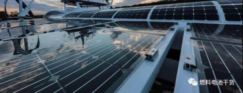 太陽能是Energy Observer雙體船上的主要能量源頭。發(fā)電面板面積總計(jì)141 m2,與面板連接的Prysmian電纜總長6.2 km,電纜采用自航天航空中的輕量化技術(shù)。Energy Observer雙體船上主要采用兩種太陽能電池技術(shù):可彎曲光伏面板和雙面光伏面板。