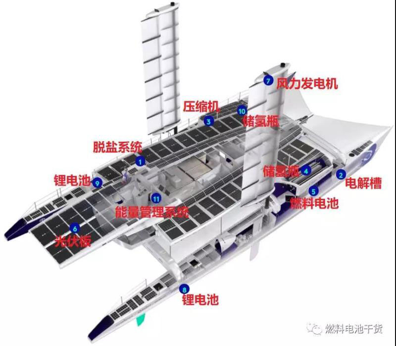 Energy Observer雙體船主要提供三種動(dòng)力模式:1)正常航行中,由太陽能或風(fēng)能直接為推進(jìn)提供動(dòng)力;2)發(fā)電量暫時(shí)下降期間,鋰電池組將接管,為推進(jìn)提供動(dòng)力;3)長時(shí)間停船期,燃料電池將接管,消耗氫氣發(fā)電和儲(chǔ)電。