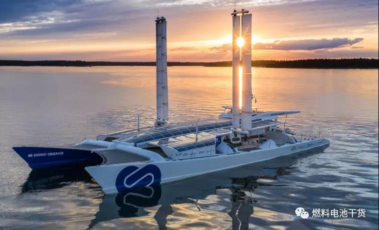Energy Observer集中驗(yàn)證和使用可再生能源發(fā)電+電解水+氫燃料電池的解決方案,將進(jìn)一步為綠色氫燃料電池的全面推廣提供案例和參考。Energy Observer搭載的燃料電池系統(tǒng)由豐田歐洲技術(shù)中心僅7個(gè)月時(shí)間設(shè)計(jì)并裝配完成。該船長31m、寬13m、高度12.85m、吃水2.2m、重量34t、有8名機(jī)組人員、平均航速4/5節(jié)(電力)。Energy Observer雙體船動(dòng)力系統(tǒng)主要由風(fēng)力發(fā)電、光伏發(fā)電、海水脫鹽系統(tǒng)、電解槽、壓縮機(jī)、儲(chǔ)氫瓶、燃料電池和能量管理系統(tǒng)組成。