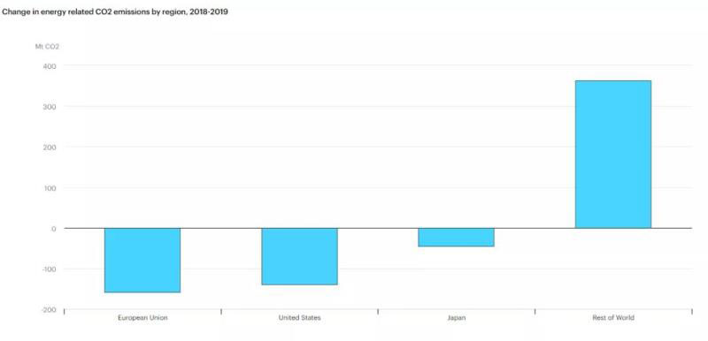 就煤炭而言,全球煤炭消費(fèi)二氧化碳排放量較2018年下降近2億噸,降幅為1.3%,抵消了石油和天然氣消費(fèi)排放量的增加。發(fā)達(dá)國(guó)家經(jīng)濟(jì)體的排放量減少了3.7億噸(3.2%),其中85%來(lái)自電力部門。