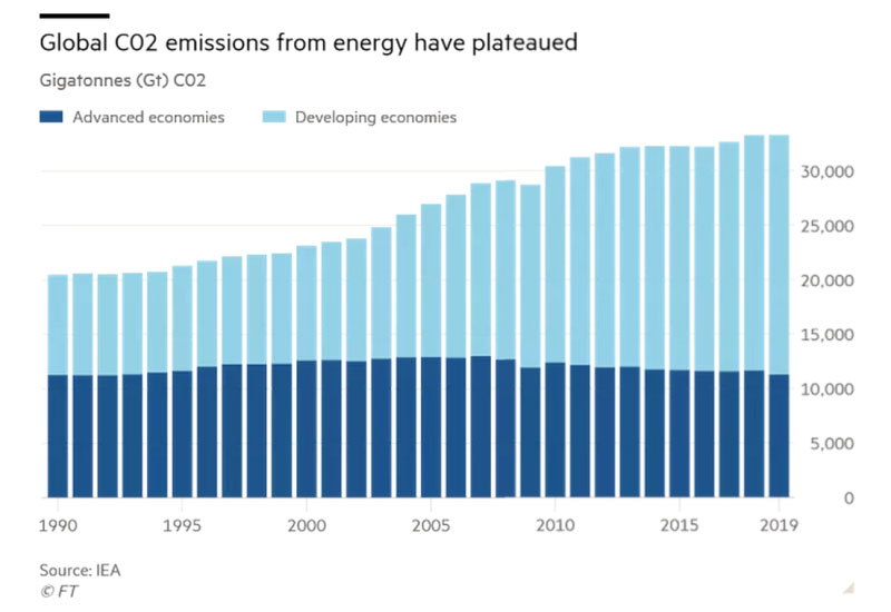 根據(jù)國(guó)際能源署發(fā)布的數(shù)據(jù),全球能源相關(guān)的二氧化碳排放量在經(jīng)過(guò)兩年的增長(zhǎng)后,2019年排放量3300億噸左右,與上一年持平。這主要是由于發(fā)達(dá)經(jīng)濟(jì)體電力部門的二氧化碳排放量急劇下降,歸功于可再生能源(主要是風(fēng)能和太陽(yáng)能光伏)的作用不斷擴(kuò)大,天然氣對(duì)煤的替代以及核電的增長(zhǎng)。