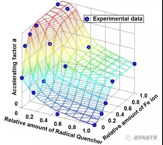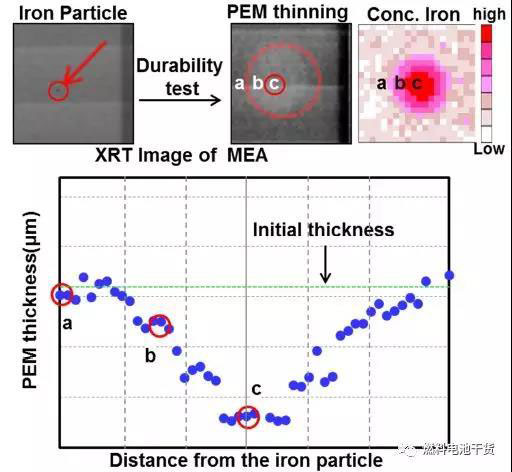 眾所周知,電化學(xué)反應(yīng)的中間產(chǎn)物OH自由基穿越質(zhì)子膜會引起其降解。已知Fe離子可通過OH自由基來加速化學(xué)降解。另一方面,存在具有清除自由基的共軛體系的金屬離子或有機(jī)分子,但必須使用適量的這些添加劑(降低H+的電導(dǎo)率率)。下圖為化學(xué)降解的加速因子與Fe離子量和用作添加劑的自由基猝滅劑量的關(guān)系圖??墒褂迷搱D來設(shè)計(jì)質(zhì)子膜厚度以滿足膜壽命。另外,可以看出鐵顆粒變成鐵離子使質(zhì)子膜厚度局部變薄。詳情請查閱本田:質(zhì)子交換膜的化學(xué)衰減壽命評價(jià)技術(shù)。