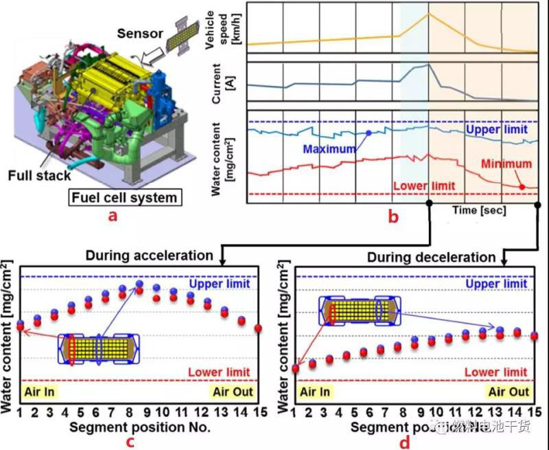 由于在減速之前的高電流發(fā)電使電堆溫度升高,因此飽和水蒸氣含量較高,并且電堆出口排水量增加。減速過程中,由于空氣供應(yīng)響應(yīng)延遲導(dǎo)致空氣體積流量過大。這些因素協(xié)同作用導(dǎo)致進(jìn)氣口附近的平面CCM含水量下降。其實(shí),在每種情況下,都應(yīng)將確保燃料電池堆耐久性所需的平面CCM水含量保持在上限值和下限值之內(nèi)。