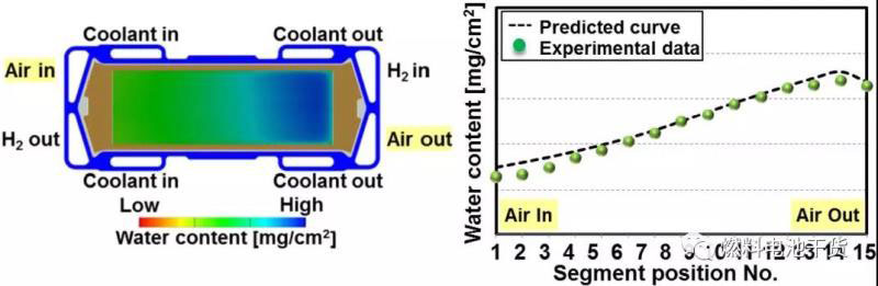目前市場上存在幾種商用燃料電池模擬軟件。該項(xiàng)研究選擇了市場上某型燃料電池仿真軟件,該軟件針對車用燃料電池堆開發(fā)具有足夠的仿真精度和效率。通過結(jié)合水分布的實(shí)驗(yàn)結(jié)果并修改原始函數(shù),開發(fā)了CCM平面水分布的仿真模型。上圖分別顯示了CCM平面內(nèi)水分布的模擬結(jié)果以及模擬和測量結(jié)果的比較情況。可以看出,模擬結(jié)果和測量結(jié)果之間有很好的對應(yīng)關(guān)系。此外,通過使用樹脂框架來優(yōu)化氫氣和空氣的分布,可使燃料電池活性面積較短一側(cè)方向上的水分布變化(不一致性)降至最低。