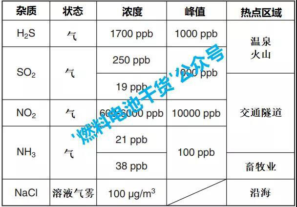 表 影響燃料電池性能的空氣雜質(zhì)