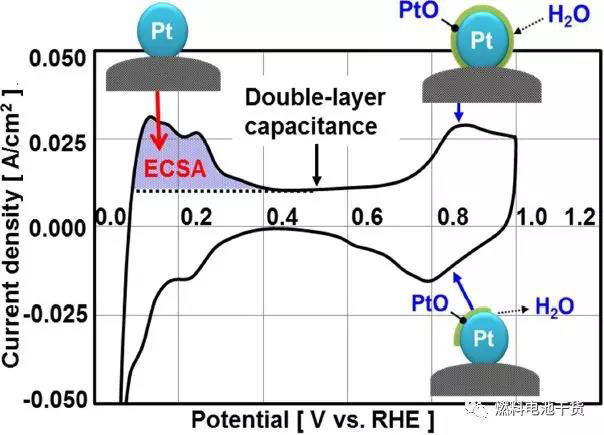 下圖為正常Pt催化劑的電流-電壓特性圖。對應(yīng)0.5 V,電池內(nèi)電化學(xué)雙層電容中監(jiān)測到電流。從0.6 V到1.0 V,Pt和水之間的吸附反應(yīng)轉(zhuǎn)化為Pt表面氧化膜的生成反應(yīng)。另一方面,PtO層中發(fā)生還原反應(yīng),且從1.0 V到0.6 VPt返回其金屬態(tài)。對應(yīng)低于0.5 V,Pt上發(fā)生質(zhì)子吸附和解析反應(yīng)(氫吸附和解析:HAD)。Pt的總HAD電荷與有效電化學(xué)面積(ECSA)成正比。因此,可以基于總的HAD電荷確定催化劑性能。