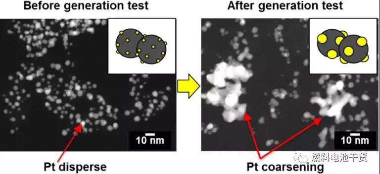 為確保燃料電池耐久性,必須保持一定的催化劑活性表面積和電解質(zhì)膜厚度。催化劑有效表面積會顯著影響電池性能輸出,一定厚度的電解質(zhì)膜確保將氧氣和氧氣分開,使陽極和陰極絕緣。催化劑層表面積和PEM厚度的維持受CCM水含量影響較大。當(dāng)水含量較高,催化劑融解、團(tuán)聚和再沉積引起催化劑有效活性面積減小。