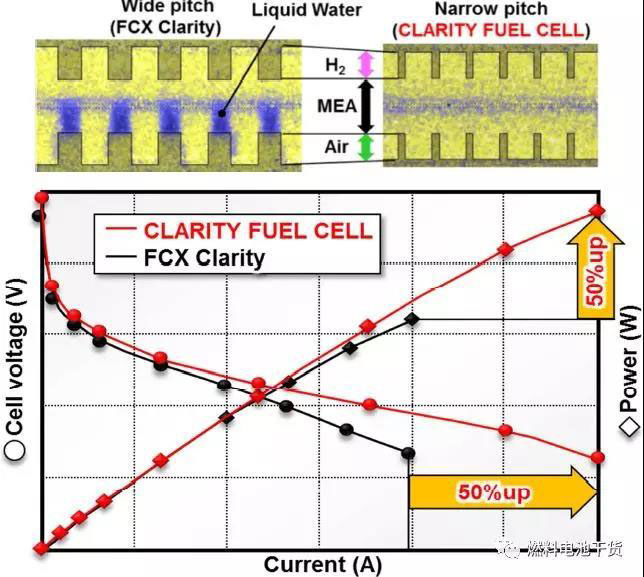 氣體流道深度的降低進(jìn)一步降低了流道周期,有效緩解了氣體擴(kuò)散層中水凝結(jié)和積累,提高氣體擴(kuò)散性能,實(shí)現(xiàn)電堆內(nèi)每片電池發(fā)電性能提高1.5倍。伴隨電池厚度薄化和性能優(yōu)化,本田Clarity燃料電池體積功率密度提高了60%,電堆數(shù)量減少30%,電堆尺寸減少33%。