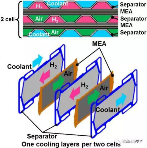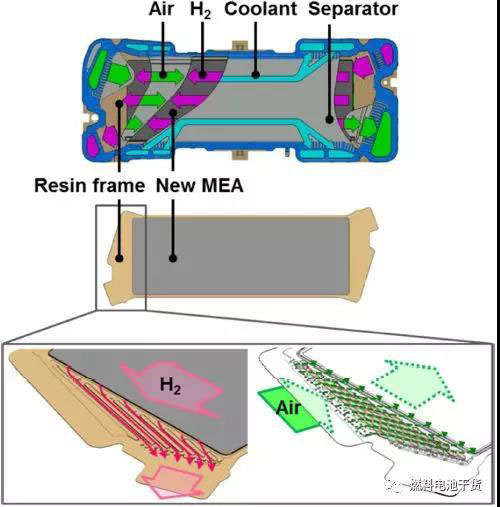 傳統(tǒng)雙極板由雙極板組件(陰陽極板)和膜電極組成的單電池經(jīng)過串聯(lián)層疊形成。本田Clarity燃料電池通過波紋性流場強(qiáng)化氣體傳質(zhì),以雙片MEA+三片極板組成一個(gè)單元(雙電池)減少燃料電池堆體積。除使用超薄MEA外,采用逆流進(jìn)氣達(dá)到循環(huán)電化學(xué)產(chǎn)物水目的。此外,通過使用樹脂框架實(shí)現(xiàn)最佳氣體分布特性,實(shí)現(xiàn)CCM內(nèi)水分分布均勻。再者,通過濕度反饋控制降低水含量。上述技術(shù)有效降低了氣體流道深度,并減小20%體積,從而實(shí)現(xiàn)了1mm電池厚度。