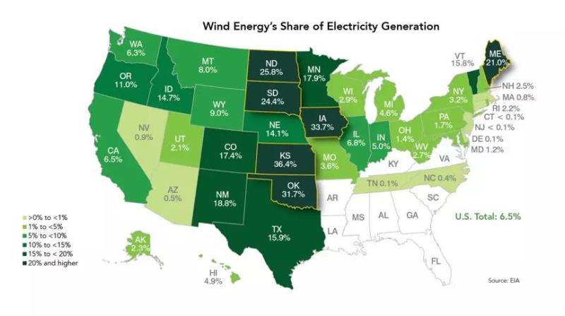 風(fēng)能在美國(guó)電力的占比超過7%,有六個(gè)州的電力占比甚至超過20%
