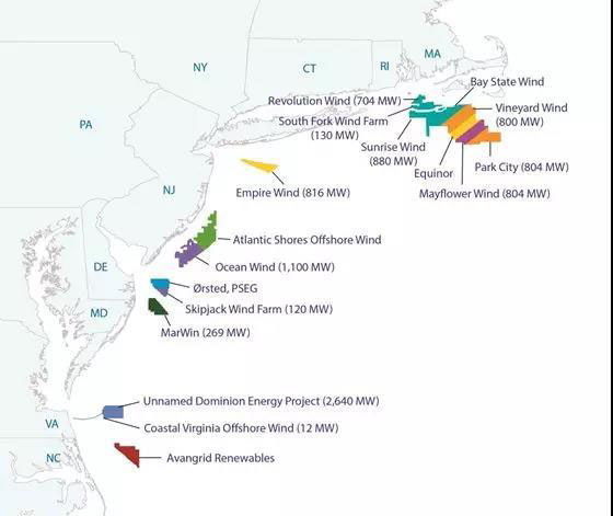 圖3:美國東海岸海上風(fēng)電分布圖