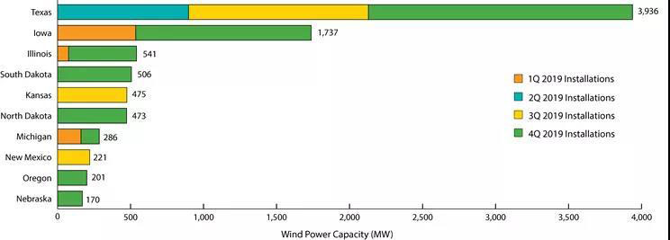 圖2:2019年美國幾大州風(fēng)電裝機(jī)容量