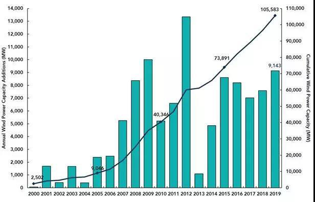 圖1:2000-2019年美國風(fēng)電新增/累計(jì)風(fēng)電裝機(jī)容量