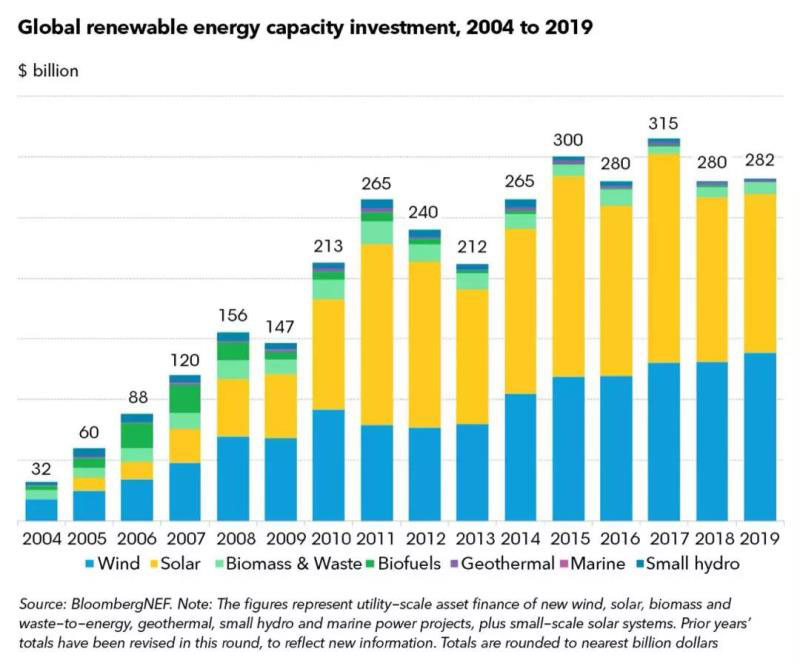 根據(jù)彭博新能源財(cái)經(jīng)(BNEF)匯總的數(shù)據(jù),2019年全球可再生能源投資為2822億美元,較2018年的2802億美元增長(zhǎng)1%,全球最大的市場(chǎng)中國(guó)有所回落,但第二大市場(chǎng)美國(guó)創(chuàng)下了新紀(jì)錄。