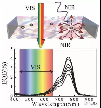 為了克服這一限制,密歇根州立大學(xué)的研究人員使用了一種略有不同的技術(shù)來(lái)收集陽(yáng)光。他們沒(méi)有嘗試創(chuàng)建透明的光伏電池(這幾乎是不可能的),而是使用透明的發(fā)光太陽(yáng)能聚光器(TLSC)。發(fā)光太陽(yáng)能聚光器(LSC)是一塊透明的塑料或玻璃,上面嵌入或涂有熒光染料或量子點(diǎn)。染料吸收光,然后發(fā)出熒光,產(chǎn)生一種輝光,該輝光通過(guò)全內(nèi)反射傳播到薄板的邊緣,在那里,光被狹窄的太陽(yáng)能電池吸收。這是一項(xiàng)很有前途的技術(shù),因?yàn)樗梢允占竺娣e的幾乎透明的玻璃,而使用面積較小的昂貴的太陽(yáng)能電池。集中系數(shù)是孔與邊緣的比率??梢哉{(diào)整發(fā)光材料以在某些波長(zhǎng)(例如紫外線UV)吸收,并在較長(zhǎng)的波長(zhǎng)處重新發(fā)射,在更長(zhǎng)的波長(zhǎng)處,硅的吸收是最佳的。[研究論文:DOI:10.1002 / adom.201400103 –“近紅外收集透明發(fā)光太陽(yáng)能聚光器”]