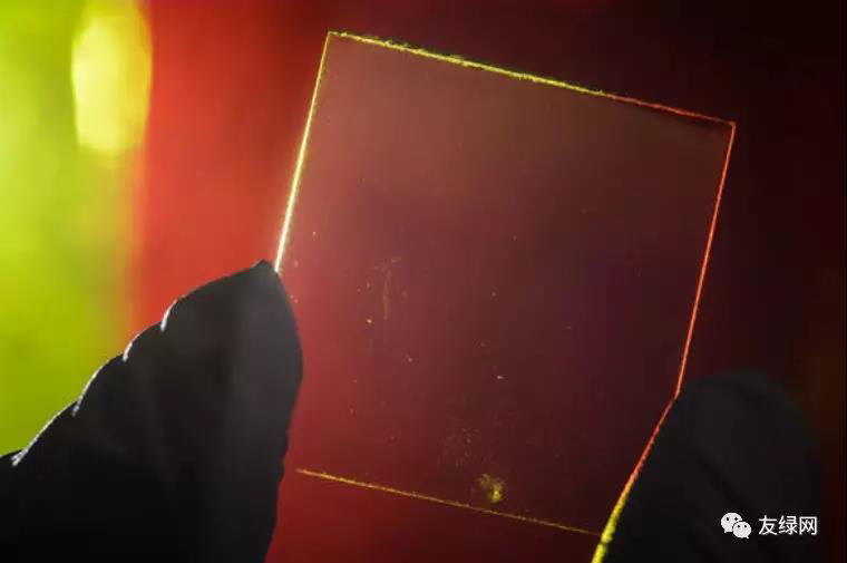 如果仔細(xì)觀察,您會(huì)在材料塊的邊緣看到幾個(gè)黑條。但是,活性有機(jī)材料以及整個(gè)太陽(yáng)能電池板都是高度透明的。