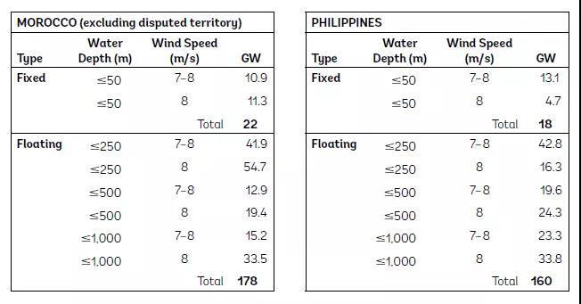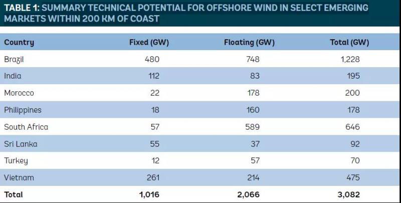 本報告介紹了關(guān)于巴西、印度、摩洛哥、菲律賓、南非、斯里蘭卡、土耳其和越南,八個海上風(fēng)電技術(shù)潛力的案例研究(這里,技術(shù)潛力是根據(jù)風(fēng)速和水深計算的)??紤]到200公里以內(nèi)的沿海海域,這8個國家共有約3.1太瓦的總技術(shù)潛力,包括10.16億千瓦的固定式裝機容量和20.66億千瓦的浮式裝機容量(見表1)。