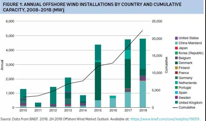 圖1 2008-2018年按國家和累計總量劃分的年度海上風(fēng)電裝機容量(兆瓦)