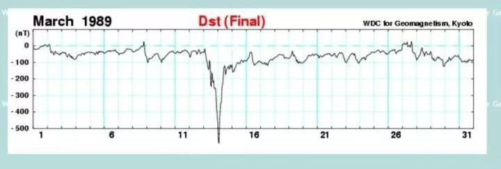 1989年3月13日發(fā)生的磁暴非常強(qiáng)烈,Dst 指數(shù)達(dá)到了-500nT以上。(科學(xué)家利用Dst指數(shù)描述磁暴的強(qiáng)度,Dst指數(shù)達(dá)到-100nT 就是強(qiáng)磁暴,達(dá)到-300nT以上就是超強(qiáng)磁暴。)