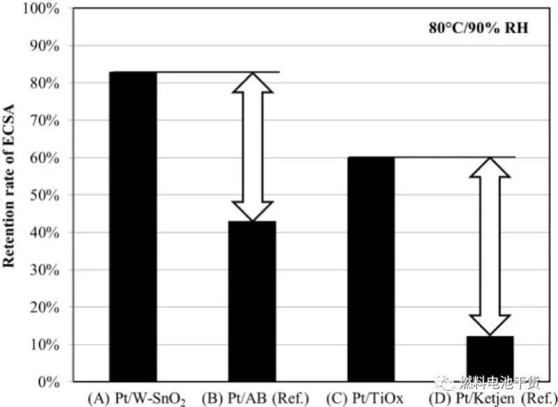 如下圖所示,由于氧化物載體在高電位下不發(fā)生腐蝕,催化層厚度也不會(huì)降低。因此,氧化物載體Pt催化劑顆粒的團(tuán)聚生長(zhǎng)被限制,電化學(xué)活性面積留存率提高。換言之,如果金屬氧化物載體MEA性能下降,很可能是因?yàn)镻t催化劑衰減導(dǎo)致,并非金屬氧化物載體衰減引起。上述現(xiàn)象表明,氧化錫或氧化鈦載體可以被用在一個(gè)追求優(yōu)異的高電位耐久性燃料電池系統(tǒng)。