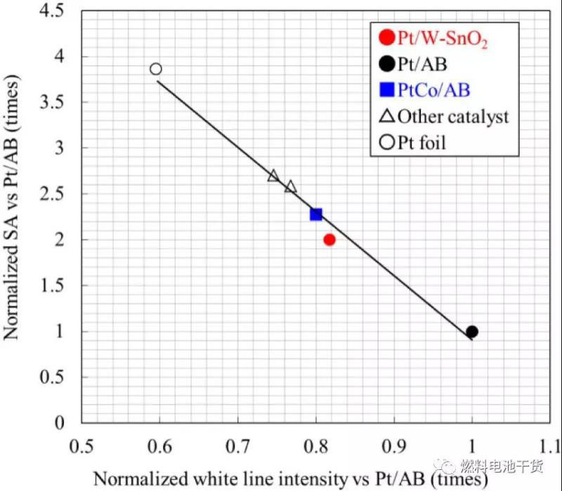 如下圖所示,氧化錫載體催化劑MEA性能在反應(yīng)催化活性的極低電密區(qū)間高于傳統(tǒng)的碳載體催化劑MEA。原因是氧化錫載體Pt催化劑的催化活性是碳載體Pt催化劑的1.9倍。氧化錫載體Pt催化劑的高催化活性由Pt-Sn鍵引起,Pt-Sn鍵使Pt-Pt原子間距變短。