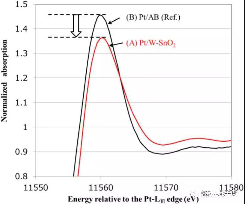 從下面兩張圖可以看到,Pt白線強(qiáng)度和X射線近邊吸收譜(XANE)測(cè)得的催化活性之間關(guān)系表面氧化錫載體Pt催化劑的電子狀態(tài)轉(zhuǎn)向更高的比活性。Pt/Sn合金的合成被認(rèn)為可以提高催化能,因此在Pt和氧化錫表面存在Pt-Sn鍵導(dǎo)致Pt/Sn合金形成。