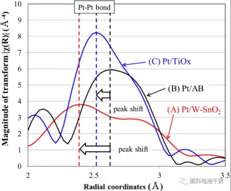 下圖為在Spring-8光源采用同步輻射進(jìn)行擴(kuò)展S射線吸收精細(xì)結(jié)構(gòu)光譜測(cè)試獲得的動(dòng)態(tài)分布函數(shù)??梢钥吹剑趸a載體Pt催化劑中Pt-Pt鍵的峰值發(fā)生了變化,峰值移位表明Pt-Sn鍵和更小Pt-Pt原子間距的形成。