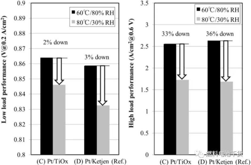 (C)Pt/TiOx和(D)Pt/Ketjen在高濕、低濕下MEA性能比較