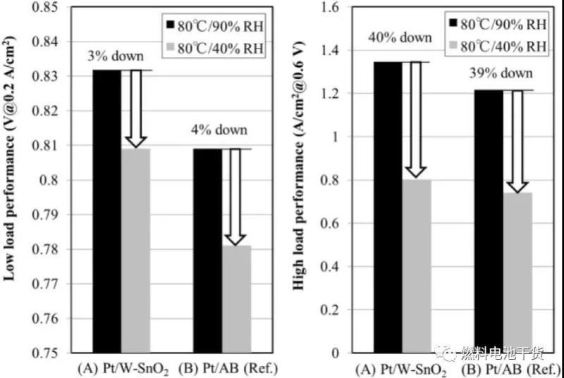 (A)Pt/W-SnO2和(B)Pt/AB在高濕、低濕下MEA性能比較