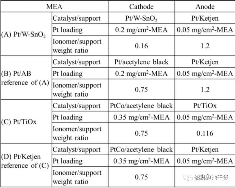 將由上述陰陽(yáng)極催化層組成和制備的膜電極裁剪成有效面積為1 cm2的MEA。質(zhì)子交換膜采用杜邦NR212膜,膜熱壓工況持續(xù)20分鐘:130℃、31 kgf/cm2。MEA的具體參數(shù)見(jiàn)下表。