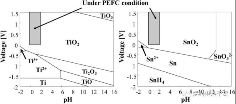 下圖為pH值和電位關(guān)系的Pourbaix圖。圖中可以看出,相比碳,氧化鈦和氧化錫在高電位環(huán)境下更穩(wěn)定,是有前途的長(zhǎng)壽命載體材料。已知,摻雜鎢或銻金屬的氧化錫和缺氧氧化鈦(如氧化鈦中具有最高電導(dǎo)率的Ti407)具有高電導(dǎo)率。因此,大量研究和報(bào)道測(cè)試了上述化合物替代碳用作燃料電池催化劑載體的適用性。即使在高溫下,氧化錫產(chǎn)生較高電導(dǎo)率的機(jī)理在氧化環(huán)境中也較為穩(wěn)定,但在超過(guò)80℃的還原條件下并不穩(wěn)定。相反,即使在高溫下,氧化鈦產(chǎn)生較高電導(dǎo)率的機(jī)理在還原環(huán)境中較為穩(wěn)定,但在超過(guò)80℃的氧化環(huán)境中并不穩(wěn)定。綜上所述,豐田汽車(chē)公司實(shí)驗(yàn)室認(rèn)為陰極和陽(yáng)極的載體材料應(yīng)分別采用氧化鈦和氧化錫。