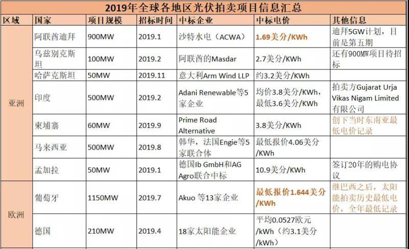 從全球可再生能源市場分析,毫無疑問的,亞洲市場占據(jù)主要地位,尤其是印度,每個(gè)季度均有數(shù)個(gè)GW級以上的項(xiàng)目招標(biāo),由于各種因素,最終流拍或撤銷的項(xiàng)目也不在少數(shù)。在2019年的最后一個(gè)月,印度還啟動(dòng)了總計(jì)2.4GW的項(xiàng)目招標(biāo)(詳見《印度啟動(dòng)1.2GW光伏+1.2GW風(fēng)光互補(bǔ)項(xiàng)目招標(biāo)》),但是由于宗教改革引發(fā)的暴亂,有可能會對這一進(jìn)程造成影響。沙特阿拉伯和阿聯(lián)酋的幾個(gè)大項(xiàng)目最終成交的投標(biāo)電價(jià),一度刷新了人們對大型光伏電站的投資認(rèn)知,泰國,馬來西亞,柬埔寨,新加坡等推出了一系列中小型光伏電站的競標(biāo)項(xiàng)目,并大力發(fā)展水面光伏。不出意外,未來幾年,東南亞地區(qū)的水面電站將如雨后春筍般冒出。日本和韓國的光伏電站競拍與其他市場的拍賣類型不同,有政府主導(dǎo)的電力補(bǔ)貼FIT,因此中標(biāo)電價(jià)在此不做討論。