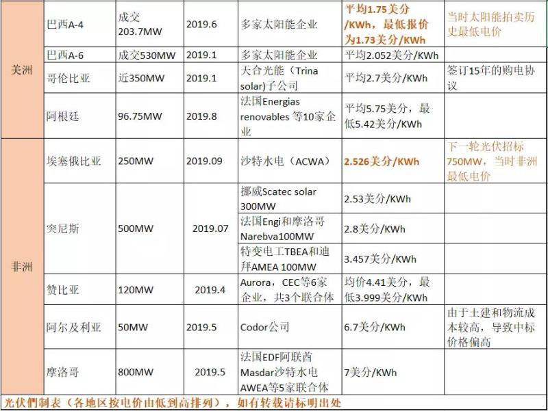 除此之外,來自中國的天合光能,特變電工,中能建等企業(yè)也都有中標(biāo)一些大型電站項(xiàng)目,印度的Adani,挪威的Scatec在今年不僅參與光伏項(xiàng)目投標(biāo),還分別取得了與組件巨頭簽訂長期采購組件協(xié)議,接受財(cái)團(tuán)增資等重大業(yè)務(wù)進(jìn)展。接來下我們以各大洲為區(qū)域劃分,分析今年的光伏投標(biāo)概況。