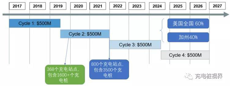 EA是在大眾汽車柴油門(mén)事件以后,大眾和EPA達(dá)成和解協(xié)議的一部分——必須在10年內(nèi)通過(guò)Electrify America在電動(dòng)汽車基礎(chǔ)設(shè)施和意識(shí)教育方面花費(fèi)20億美元(40%用于加州,其他60%用于美國(guó)其他各地)。項(xiàng)目始于2017年,到2027年將包括四個(gè)周期,并且EA的網(wǎng)絡(luò)必須向其他車企保持中立,這些站點(diǎn)都提供CCS(150kW和350kW)和CHAdeMO(50kW)兩種充電接口。