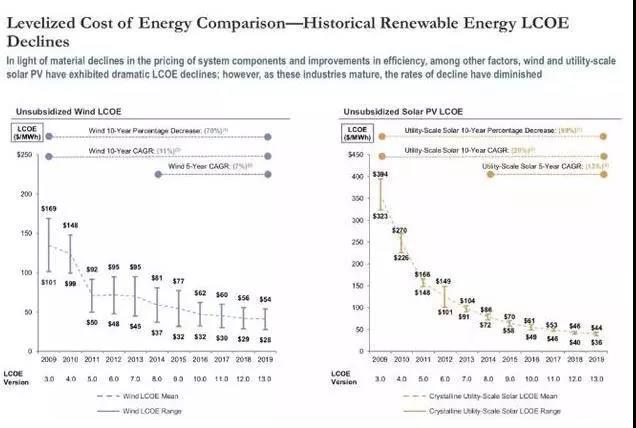 從平準(zhǔn)化成本變化趨勢來看,2009年到2019年陸上風(fēng)電LCOE下降70%,10年來年平均下降11%;大型地面光伏LCOE下降89%,10年來年平均下降20%。