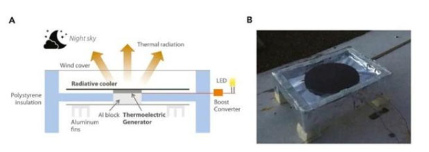 加州大學(xué)洛杉磯分校和斯坦福大學(xué)的研究人員利用了稱為輻射冷卻(radiative cooling)的原理。該原理可以應(yīng)用在晚上,主要是因為地球?qū)崃枯椛涞桨滋煳盏目臻g中。這個過程實際上可能導(dǎo)致地面變得比空氣更冷,這就是當(dāng)氣溫仍然高于冰點時,夜晚在草地上形成霜凍的方式。因為暴露于夜空的物體與用來發(fā)電的空氣之間存在溫差,它就發(fā)揮作用了。