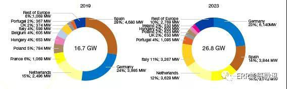 2019年和2023年歐盟28國(guó)中排名前10的太陽(yáng)能光伏市場(chǎng)