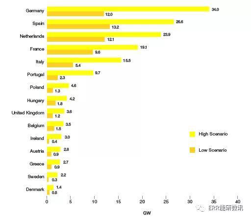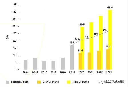 2019~2023年歐盟28國(guó)高、低情境下太陽(yáng)能光伏的新增裝機(jī)容量