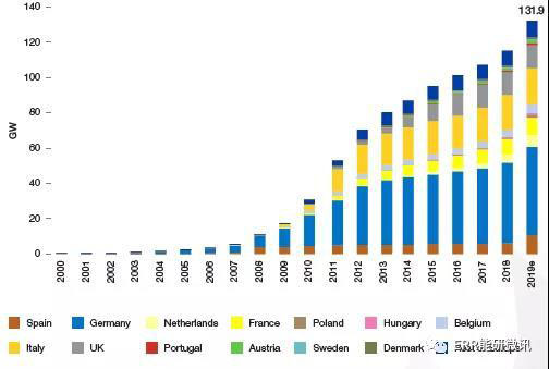 隨著歐盟對(duì)太陽(yáng)能發(fā)展支持的擴(kuò)大,到2019年底,歐盟太陽(yáng)能累計(jì)裝機(jī)容量達(dá)到131.9GW,同比增加14%(上一年底累計(jì)裝機(jī)容量為115.2GW)。