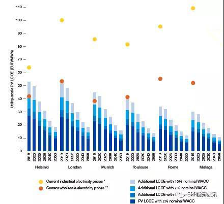 2019~2050年,歐洲6個(gè)不同地點(diǎn)太陽(yáng)能光伏的平準(zhǔn)化度電成本(LCOE)