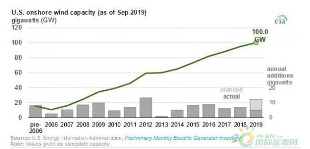 EIA預計,2019年12月將再增加7.2GW裝機量,2020年將新增14.3GW風電裝機量,如果實現(xiàn)這一目標,到明年年底,美國風電裝機量將達大約122GW。