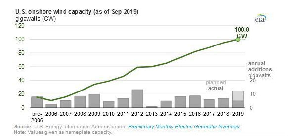 根據(jù)美國能源信息管理局(EIA)數(shù)據(jù),截至2019年9月,美國的陸上風電累計裝機容量已超過100GW,到2020年底可能達到122GW。